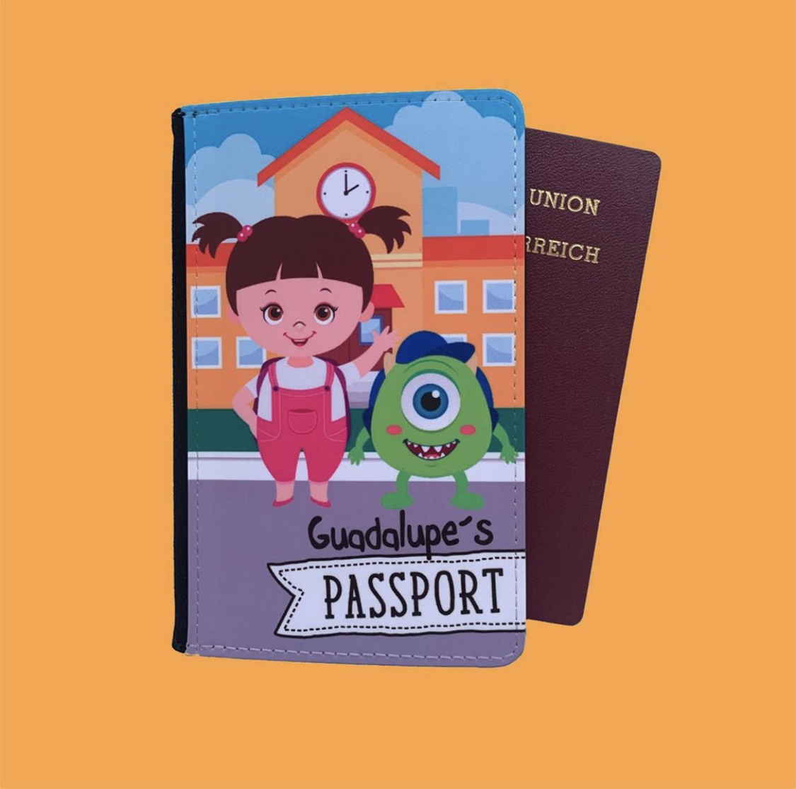 Con el portapasaporte proteges e identificas de una forma divertida tu pasaporte; En su interior hay compartimentos para documentos y tarjetas , la parte posterior su material es cuero sintético y el interior gamuza. Es posible personalizarlo con el nombre.