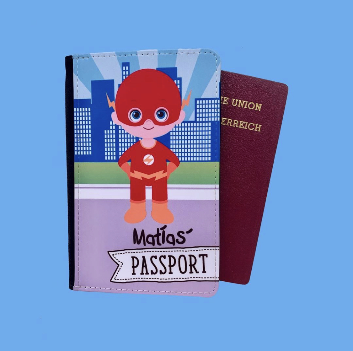 Con el portapasaporte proteges e identificas de una forma divertida tu pasaporte; En su interior hay compartimentos para documentos y tarjetas , la parte posterior su material es cuero sintético y el interior gamuza. Es posible personalizarlo con el nombre.