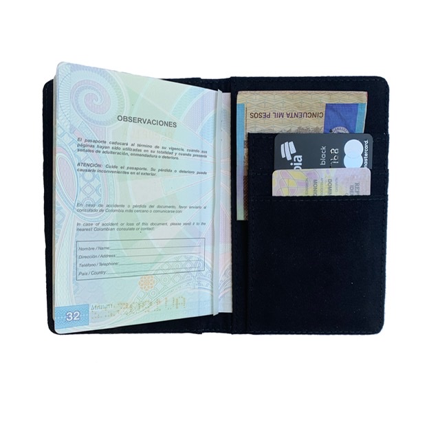 Con el portapasaporte proteges e identificas de una forma divertida tu pasaporte; En su interior hay compartimentos para documentos y tarjetas , la parte posterior su material es cuero sintético y el interior gamuza. Es posible personalizarlo con el nombre.